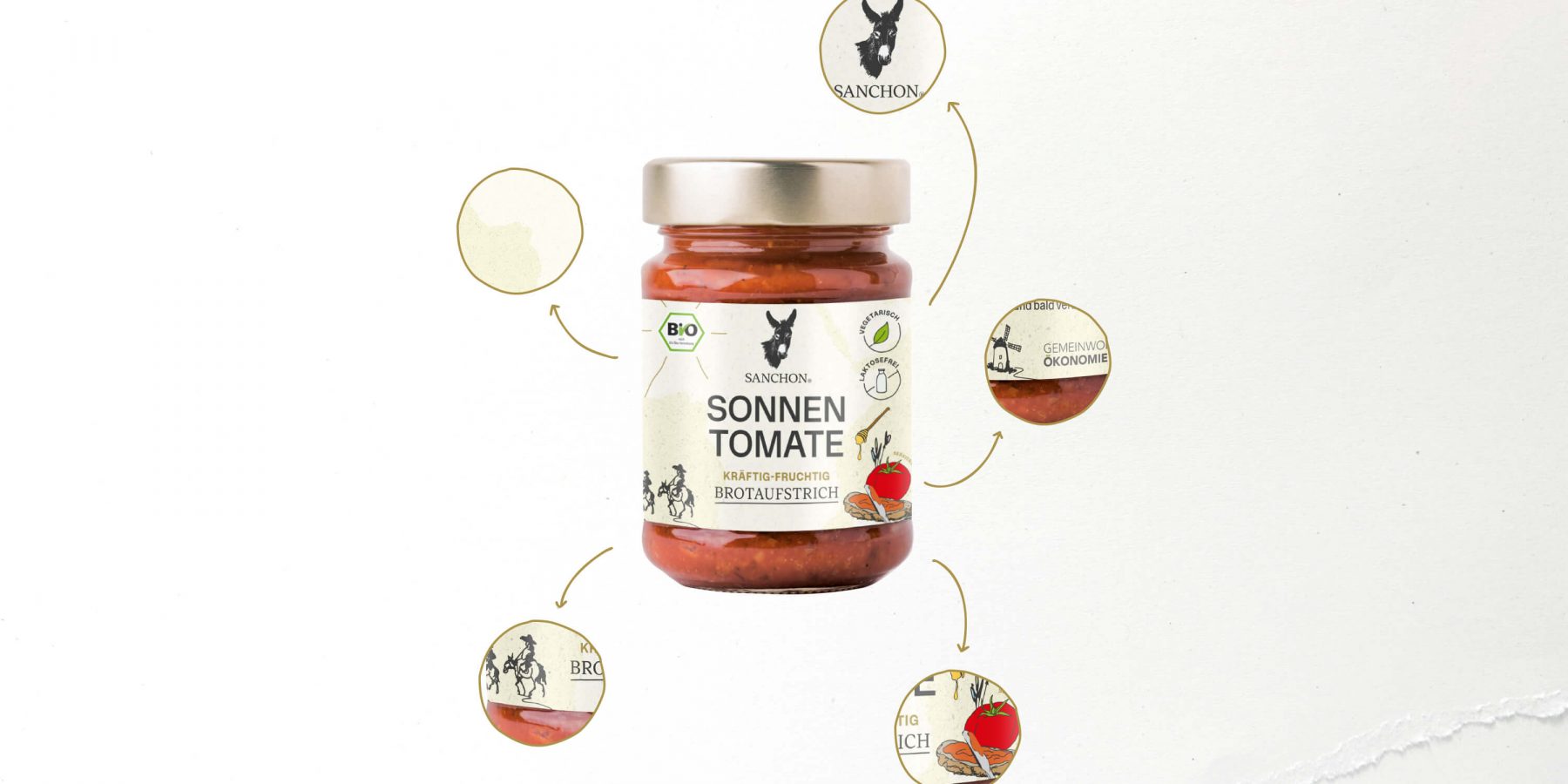 Die Illustrationen zeigen, was wirklich zählt – wie bei unserer Sonnentomate, auf der die sonnengereifte Tomate direkt sichtbar wird. In anderen Fällen stehen sie für Besonderheiten, wie das Eichenfass auf unserer Worcestershire Sauce – ein dezenter Hinweis auf die traditionelle Reifung und ihren charakteristischen Geschmack.